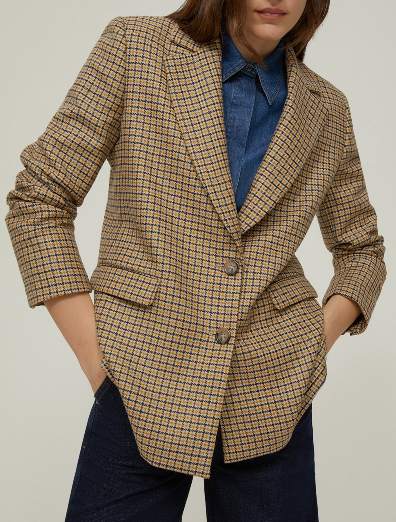 Tessuto misto lana con motivo pied-de-poule cammello e blu