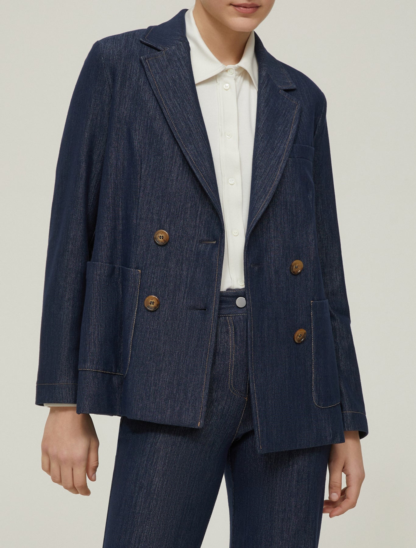 Materiale: Denim compatto ma confortevole, con cuciture a contrasto color tabacco