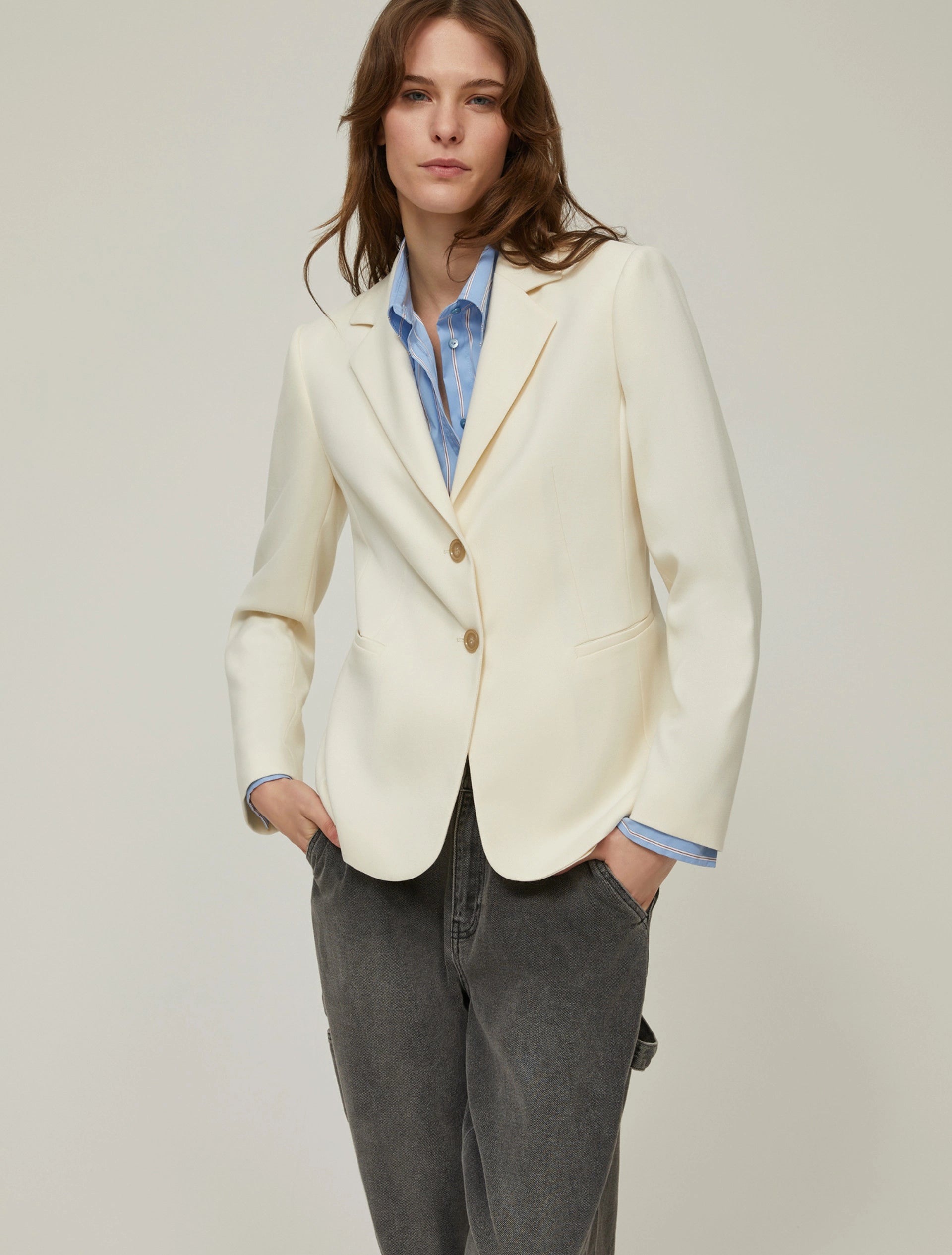 Tessuto: compatto e strutturato, probabilmente in lana o misto tecnico con una mano liscia e raffinata